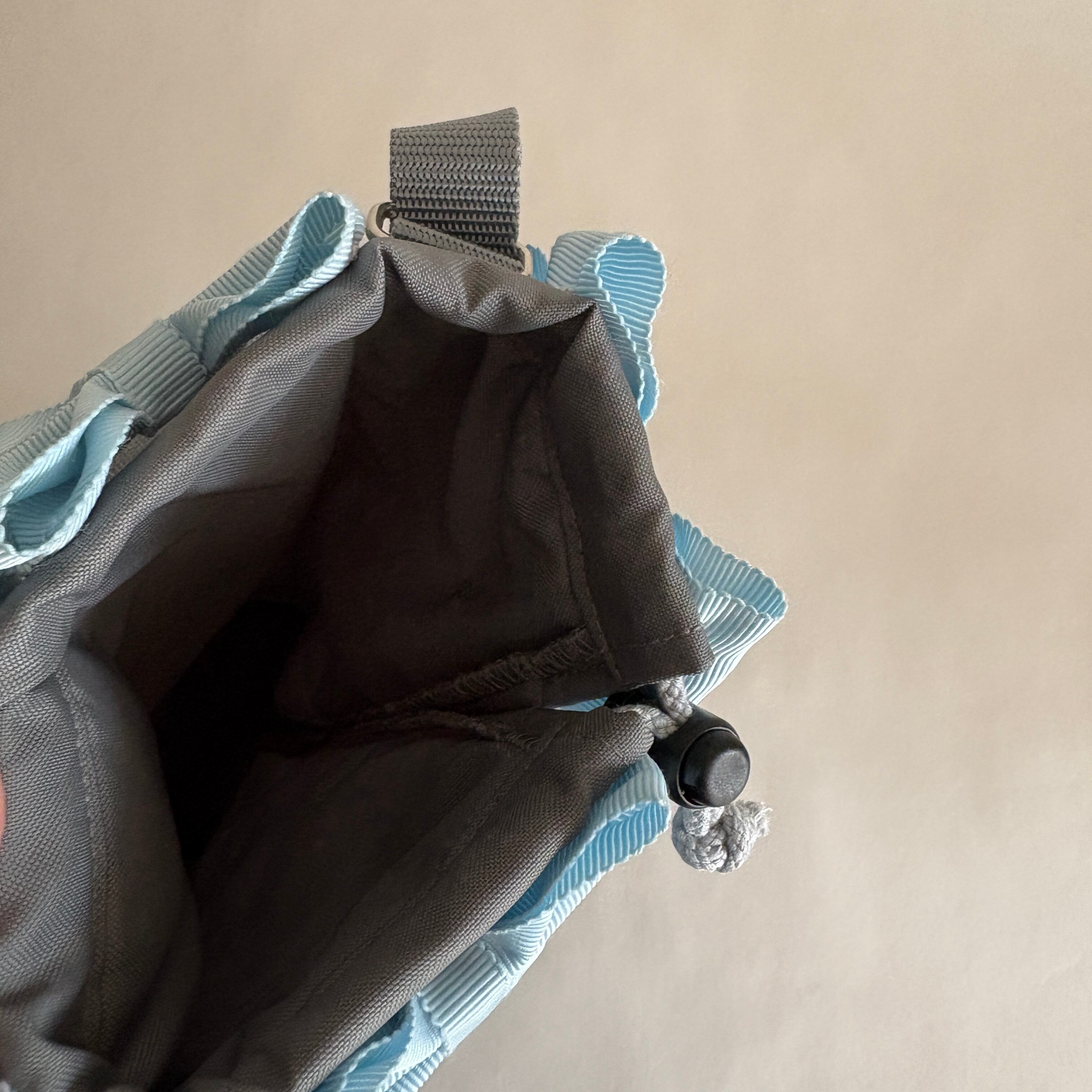 グレーの上品な色合いに、可愛らしいリボンがアクセントの水筒ホルダー。軽いナイロン素材で、持ち運びも簡単です。成長に合わせて長さ調節可能です。外出が更に楽しくなるお品です。